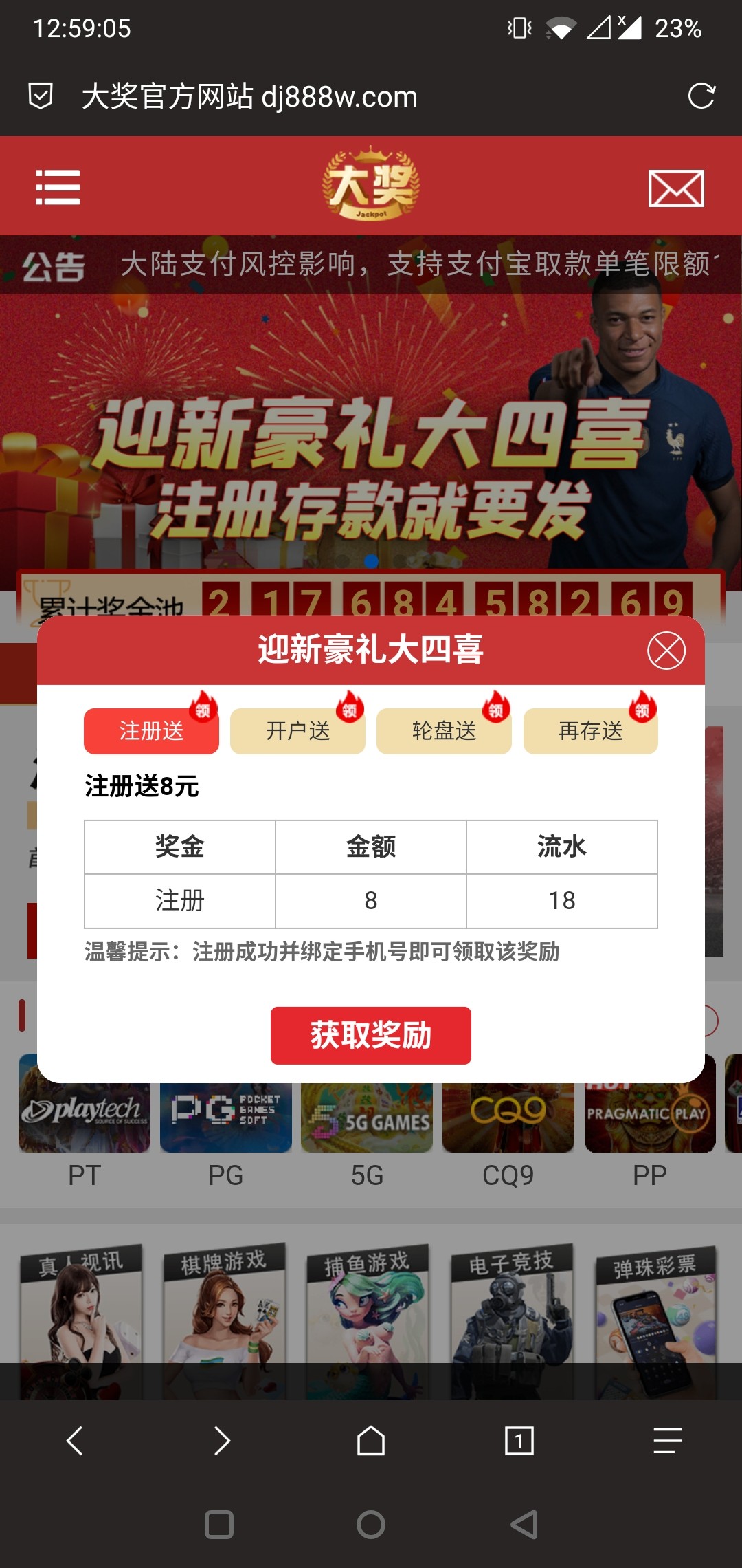 领取方式:注册绑定手机号送8彩金,18倍水